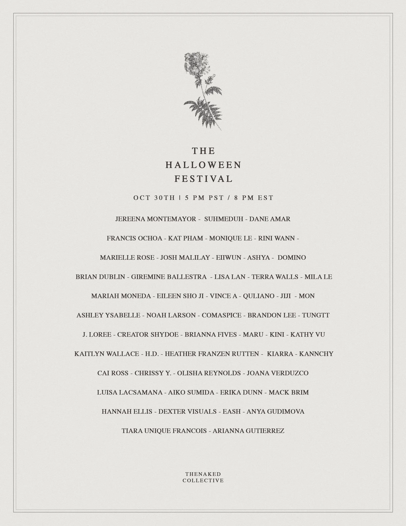 Towards the end of its lifespan, we had a final online art show for Halloween. In contrast to the “glass anatomy” aesthetic that I utilized for the first online event, I chose a different direction for the Halloween event. Instead, I developed a “stippled flora” look to encompass the entire event. And I created graphics ownable to each artist participating artist in the show (about 53 participants).